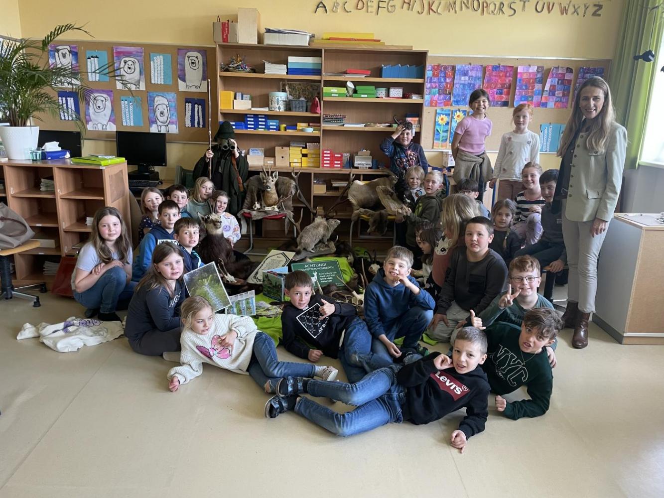 „Waidmannsheil“ hieß es am 2. April für die Kinder aus den zweiten Klassen. Ganz gespannt wurden Jägerin Sabine Gwirl und Jäger Klaus Eisler mit ihrer Gefolgschaft empfangen. Ausführlich und kindgerecht wurden den Schüler:innen die Aufgabenbereiche eines Jägers erklärt, der Lebensraum der heimischen Wildtiere nähergebracht und Fachausdrücke aus der Jägersprache gelehrt. Bei den mitgebrachten Tierpräparaten konnte man so manchen scheuen Waldbewohner in Ruhe aus nächster Nähe betrachten.