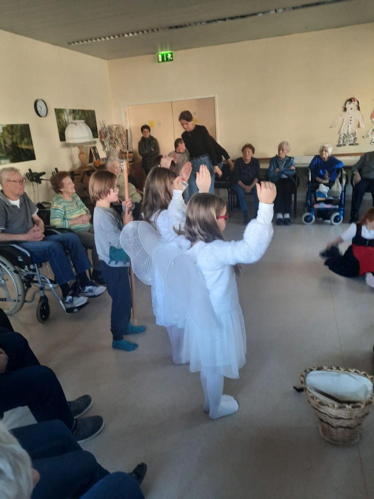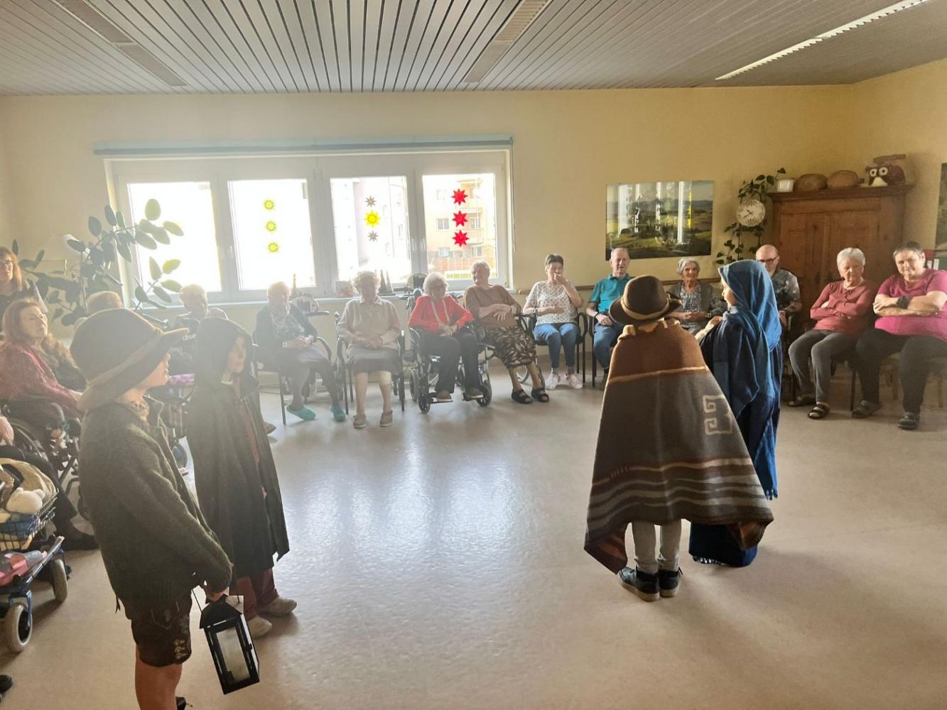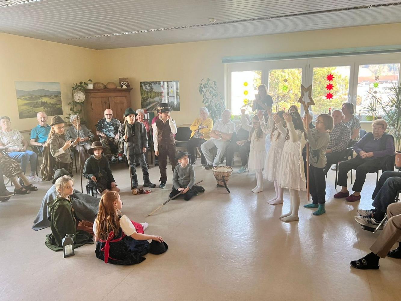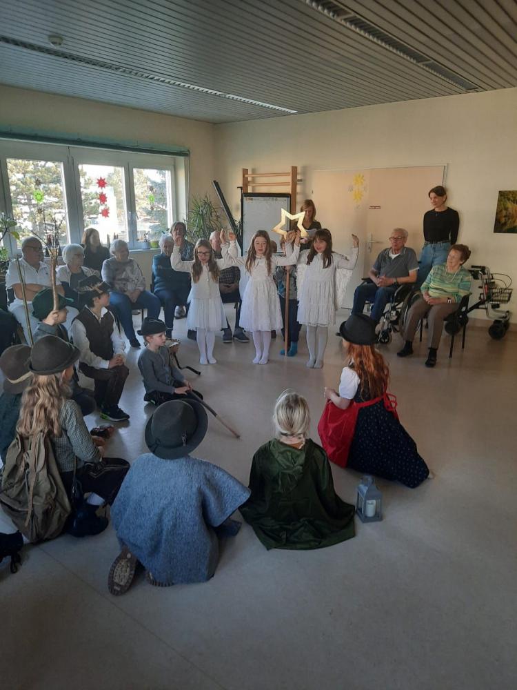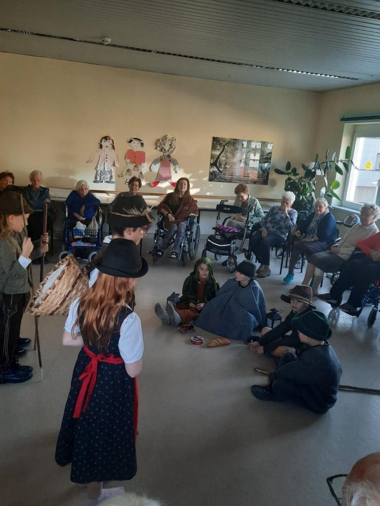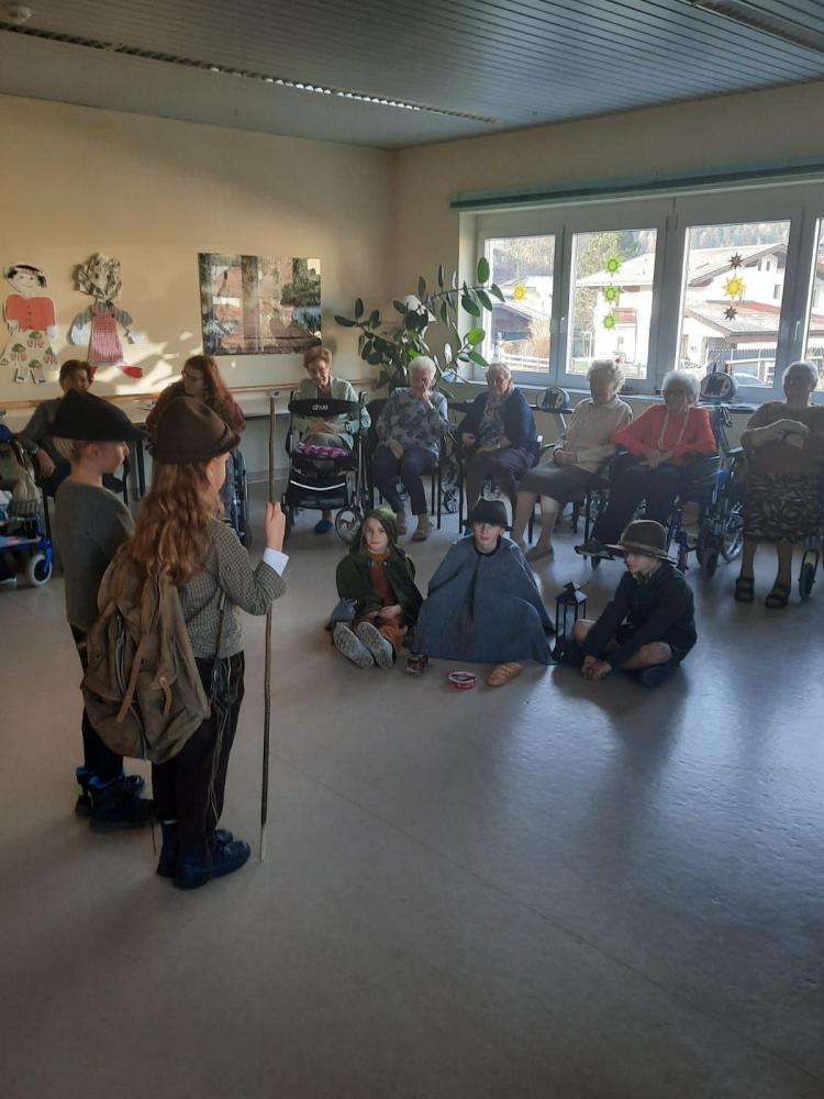 Gar einige Stunden wurden in das Einüben des Stücks investiert, viele Kleidungsstücke zusammengetragen und am Montag, den 22.Dezember, war es dann so weit: Mit Sack und Pack beladen und etwas Lampenfieber in den Hosentaschen machte man sich gemeinsam auf den Weg zum Altersheim, um das so fleißig Einstudierte den älteren Bewohnern vorzuspielen.