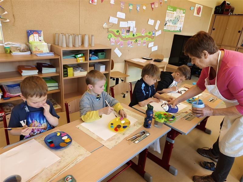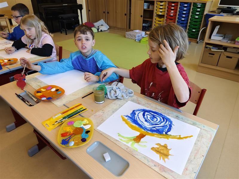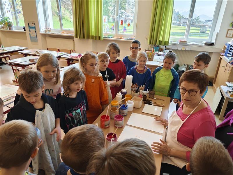 Zu Beginn erklärte uns Beatrix den Umgang mit den Farben, wie das Mischen und Verwässern der Farben funktionierten und welche Techniken des Malens möglich waren. Nun durften die Kinder ihre eigenen Kunstwerke gestalten. Das kraftvolle Highlight war die Farbe Gold, die den Bildern einen besonderen Effekt verlieh. Schließlich bemalten wir noch ein buntes Osterei, das die frühlingshaften Gestecke zum Leuchten bringen wird.